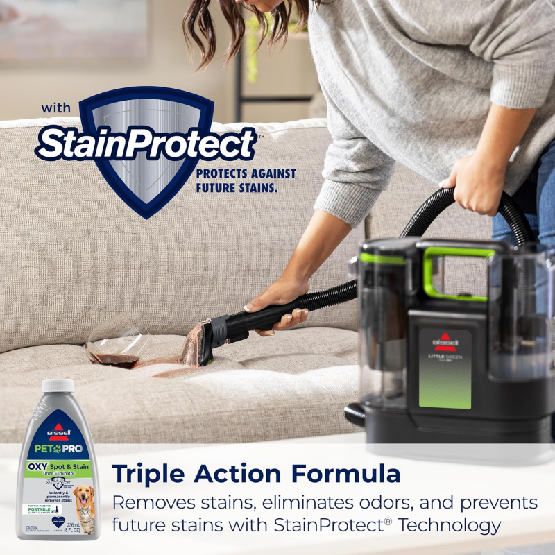 Eliminación instantánea y permanente de manchas de mascotas. Uso con fórmula de triple acción PET PRO OXY Spot & Stain con eliminador de orina y tecnología StainProtect para proteger contra manchas futuras.