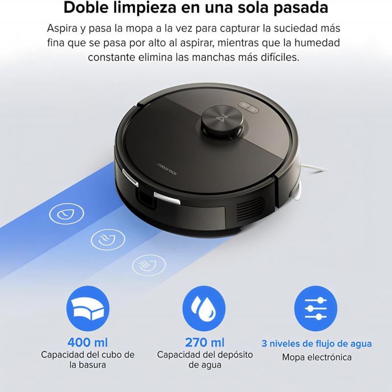 Aspira y trapea al mismo tiempo: limpieza 2 en 1 más eficiente: El depósito de agua de 270 ml permite que esta robot aspiradora y trapeador aspire y trapee simultáneamente. Puedes elegir entre tres niveles de agua para adaptarse a distintos tipos de pisos. Cubre hasta 210 m² al trapear o 160 m² al aspirar en una sola sesión de hasta 150 minutos, con mopa desmontable para mayor comodidad.