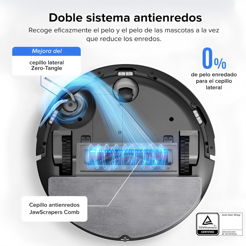 Sistema doble antienredos ideal para hogares con mascotas: Esta aspiradora robot inteligente está equipada con el cepillo principal JawScrapers Comb y un cepillo lateral antienredos, lo cual reduce significativamente la acumulación de pelos. Esto facilita el mantenimiento, evita bloqueos y garantiza una limpieza continua, ideal para hogares con mascotas o personas con cabello largo.