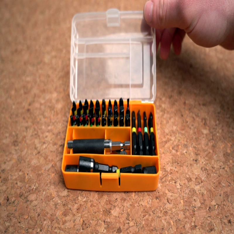 Accesorios organizados por tipos y tamaños. Caja resistente para guardar y transportar las brocas con facilidad.