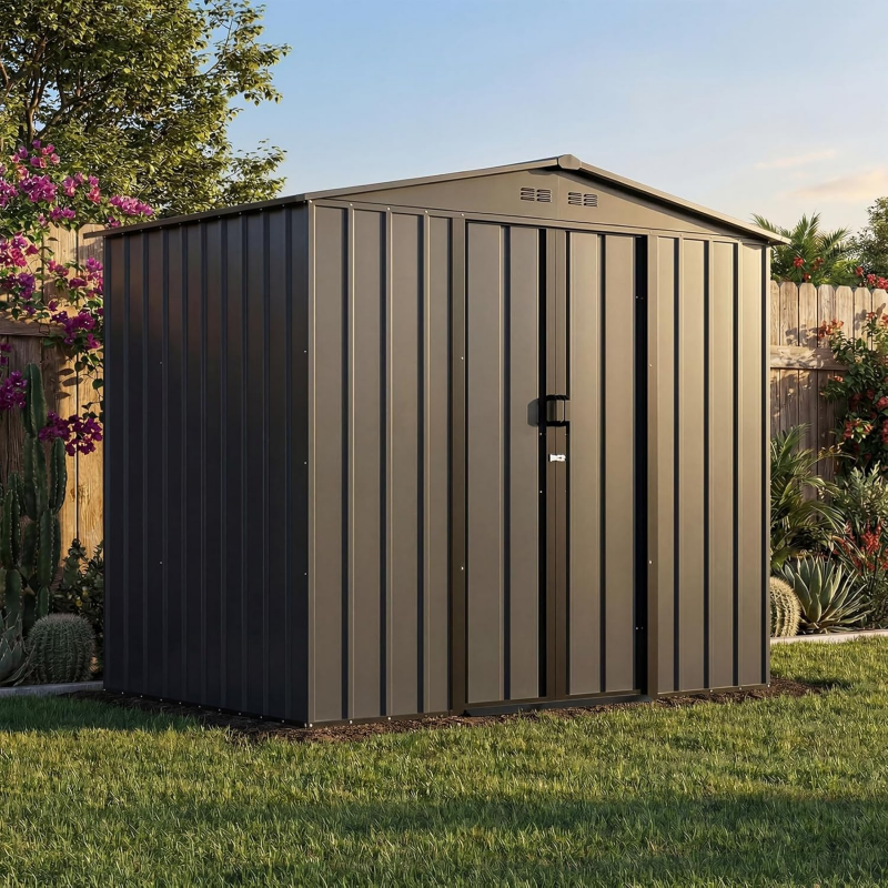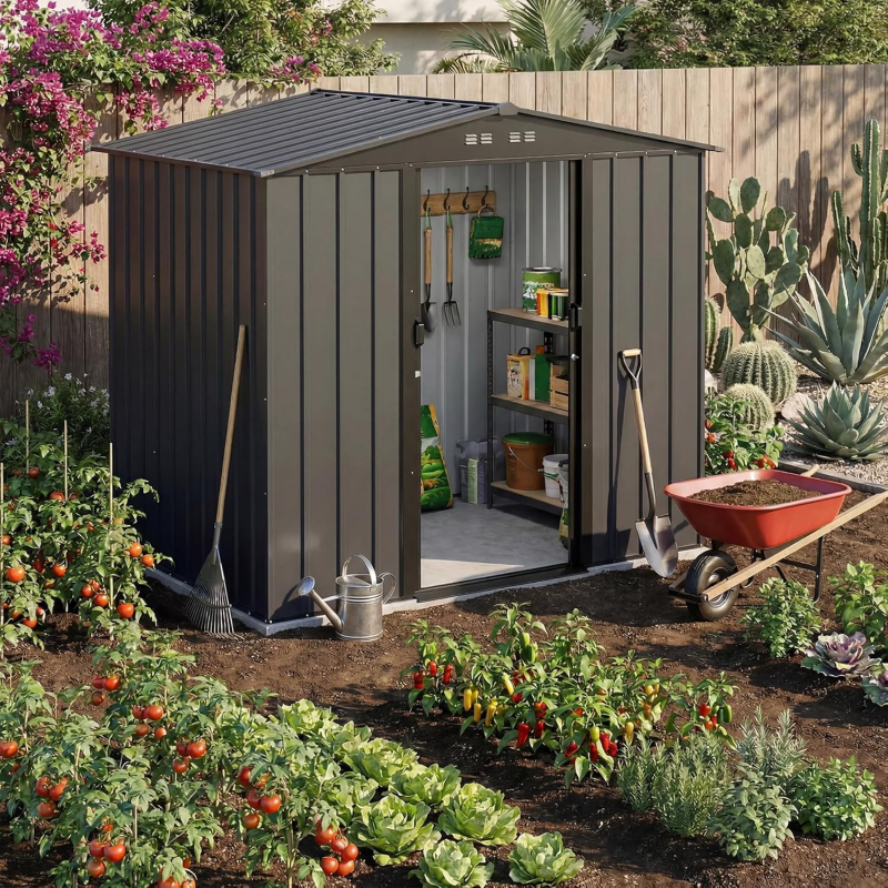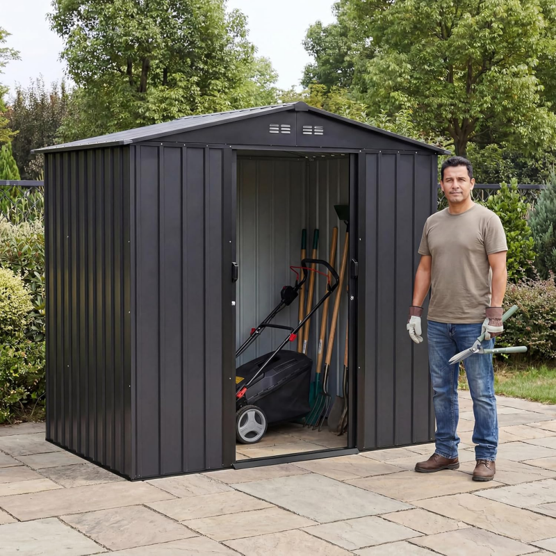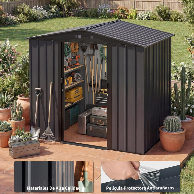 Cobertizo de Almacenamiento Diseño:Cobertizo cuenta con dos rejillas de ventilación y una estructura de puerta corredera,cobertizo almacenamiento exterior Espacio de apertura de puerta más grande,almacenamiento exterior Acceso más cómodo,bodega de almacenamiento exterior Uso flexible incluso en espacios reducidos como patios,cobertizo exterior Se proporcionan aberturas de ventilación Bodega Exterior permite almacenar sus pertenencias durante todo el año en un cobertizo de almacenamiento fresco y seco
