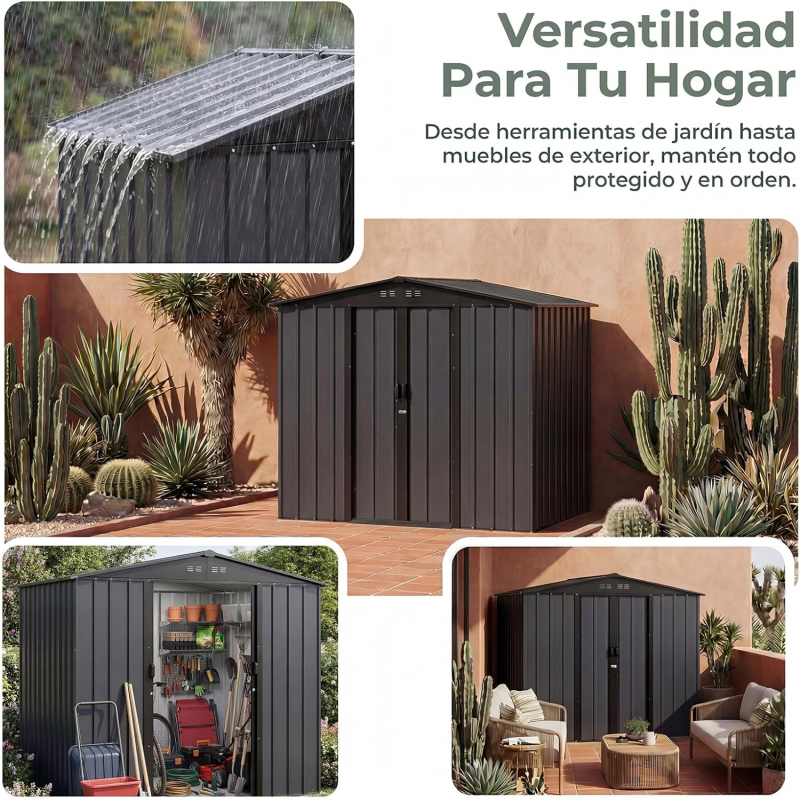 Cobertizo de Almacenamiento Robusto y Duradero:cobertizo construido con una estructura robusta y chapa metálica,Asegúrese de que el cobertizo almacenamiento exterior pueda utilizarse durante mucho tiempo almacenamiento exterior Estabilidad,Exterior Cobertizo puertas con cerradura que garantizan la seguridad,casa de almacenamiento para exterior Se utiliza un tejado a dos aguas,bodega exterior También puede guiar rápidamente el agua de lluvia para que se deslice,reduciendo la acumulación de agua (Nota: Excluyendo la estructura del piso)