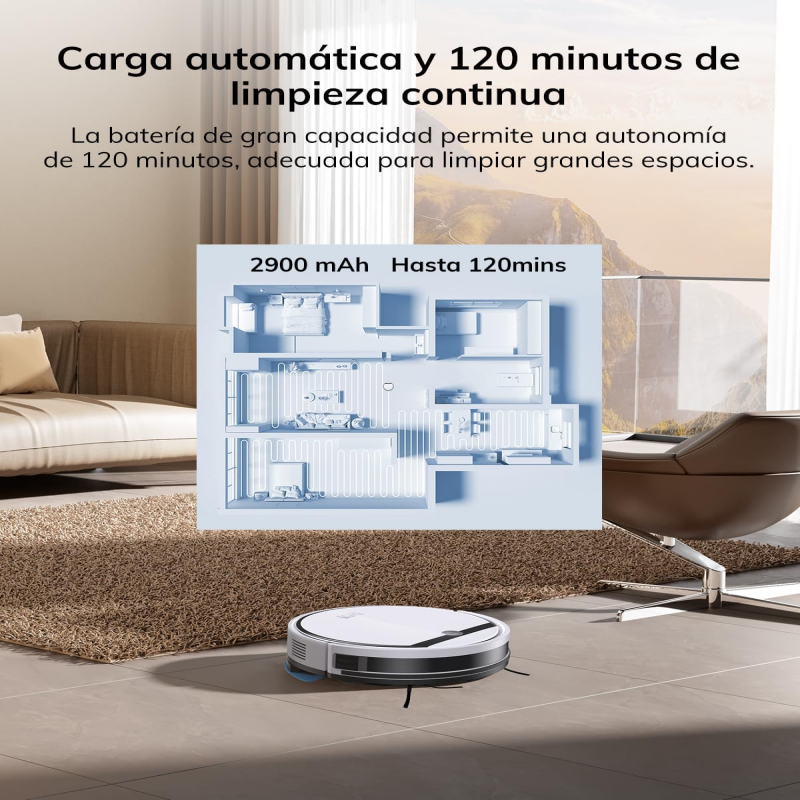 ILIFE V3x puede limpiar hasta 120 minutos, con un alcance máximo de limpieza de 1290ft² en modo silencioso. Cuando la batería está baja o la limpieza se ha completado, volverá automáticamente a la base de carga.