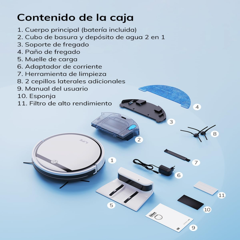 6. [Contenido del paquete] Robot V3x, 1 soporte de trapeado, 1 paño de trapeador, 1 depósito combinado de polvo y agua, 1 base de carga, 1 adaptador de corriente (1.5 metros aprox.), 2 cepillos laterales extra, 1 filtro de alto rendimiento, 1 esponja, 1 herramienta de limpieza, 1 manual de usuario y nuestra garantía sin preocupaciones de 12 meses, además de un servicio de atención al cliente confiable.