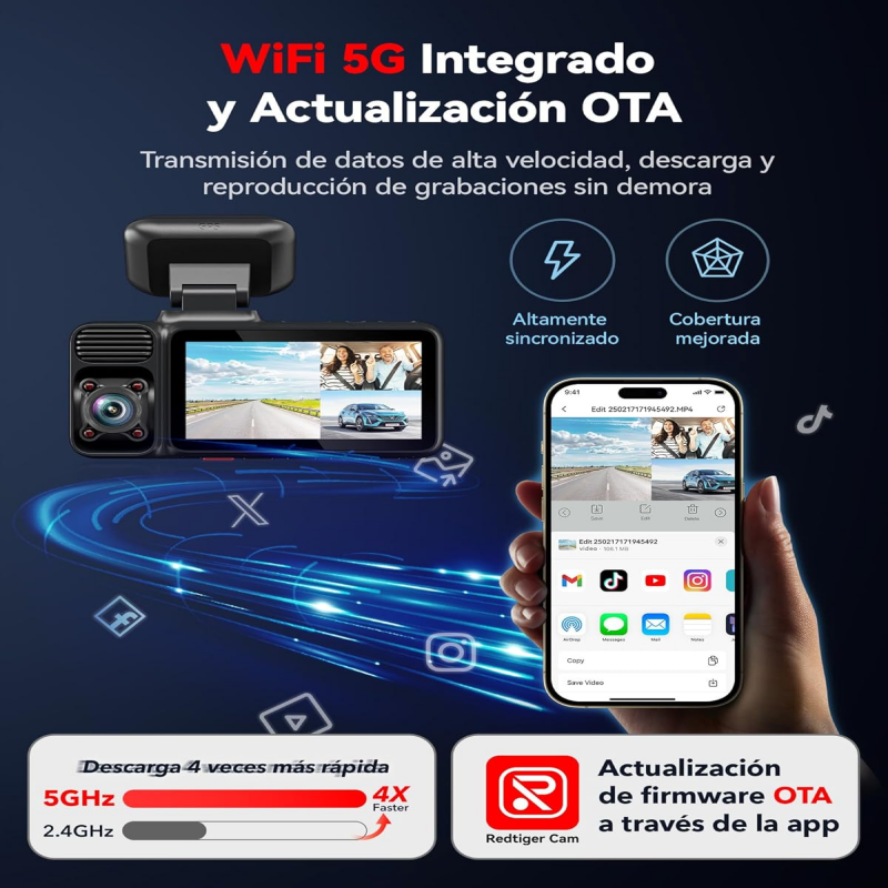 [Wi-Fi 5G y GPS Mejorados] La cámara para carro F17 es compatible con la aplicación Redtiger Cam, que te permite acceder instantáneamente a los videos y registrar rutas en tu teléfono. Con Wi-Fi 5G, disfrutarás de una transferencia de datos inalámbrica más rápida y podrás compartir videos fácilmente mientras estás en movimiento. Reproduce simultáneamente videos de 3 canales, monitorea las métricas de video sin esfuerzo y obtén datos GPS en tiempo real como evidencia en caso de accidentes