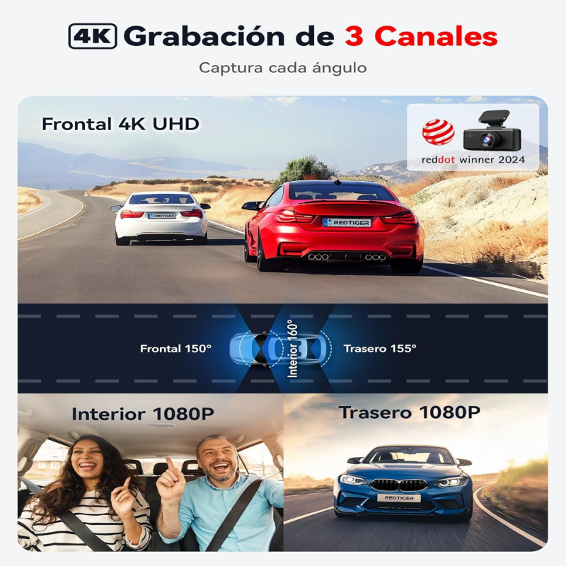 [Dashcam para Auto de 3 Canales] La cámara REDTIGER F17 captura imágenes cristalinas con su cámara frontal 4K y cámaras interior y trasera de 1080P en la carretera. Con un ángulo de visión frontal de 150°, de cabina de 160° y trasero de 155°, esta dashcam triple asegura que no te pierdas ningún momento y te mantengas protegido con una cobertura de 360°, la elección perfecta para conductores diarios y viajes familiares