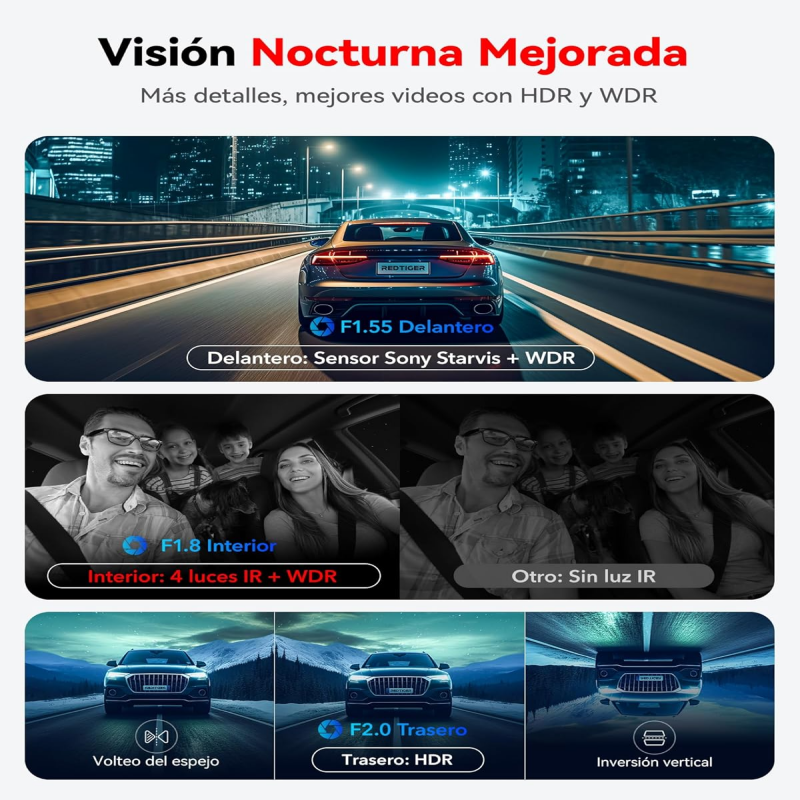 [Visión Nocturna Mejorada] Con un sensor Starvis, 4 luces IR y tecnología WDR, la cámara para auto REDTIGER 4K ofrece una mejor visión nocturna. Obtén una claridad excepcional, incluso en entornos con poca luz. Gracias a la cámara frontal, trasera e interior, puedes conducir con seguridad tanto de día como de noche. No permitas que la oscuridad comprometa tu seguridad, graba cada detalle con claridad