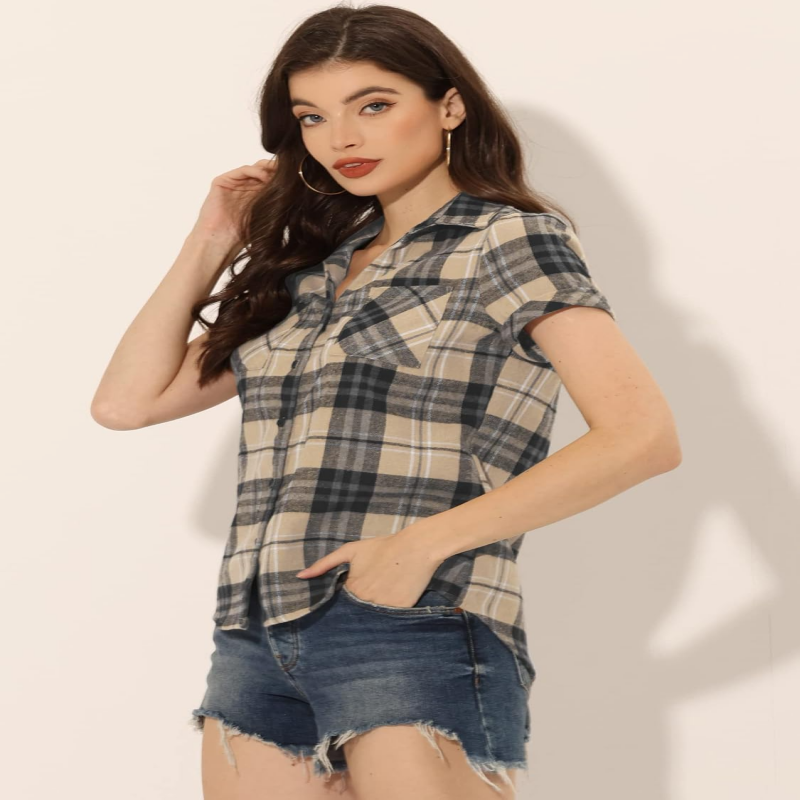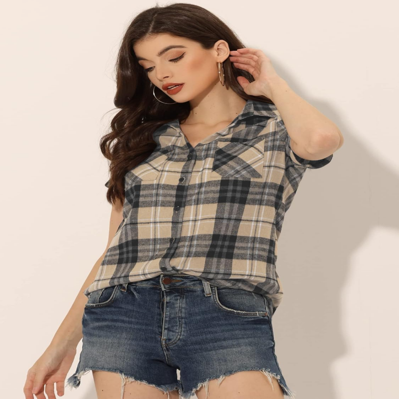 Franela, abotonado, camisa a cuadros, blusa con bolsillos, parte superior a cuadros.
